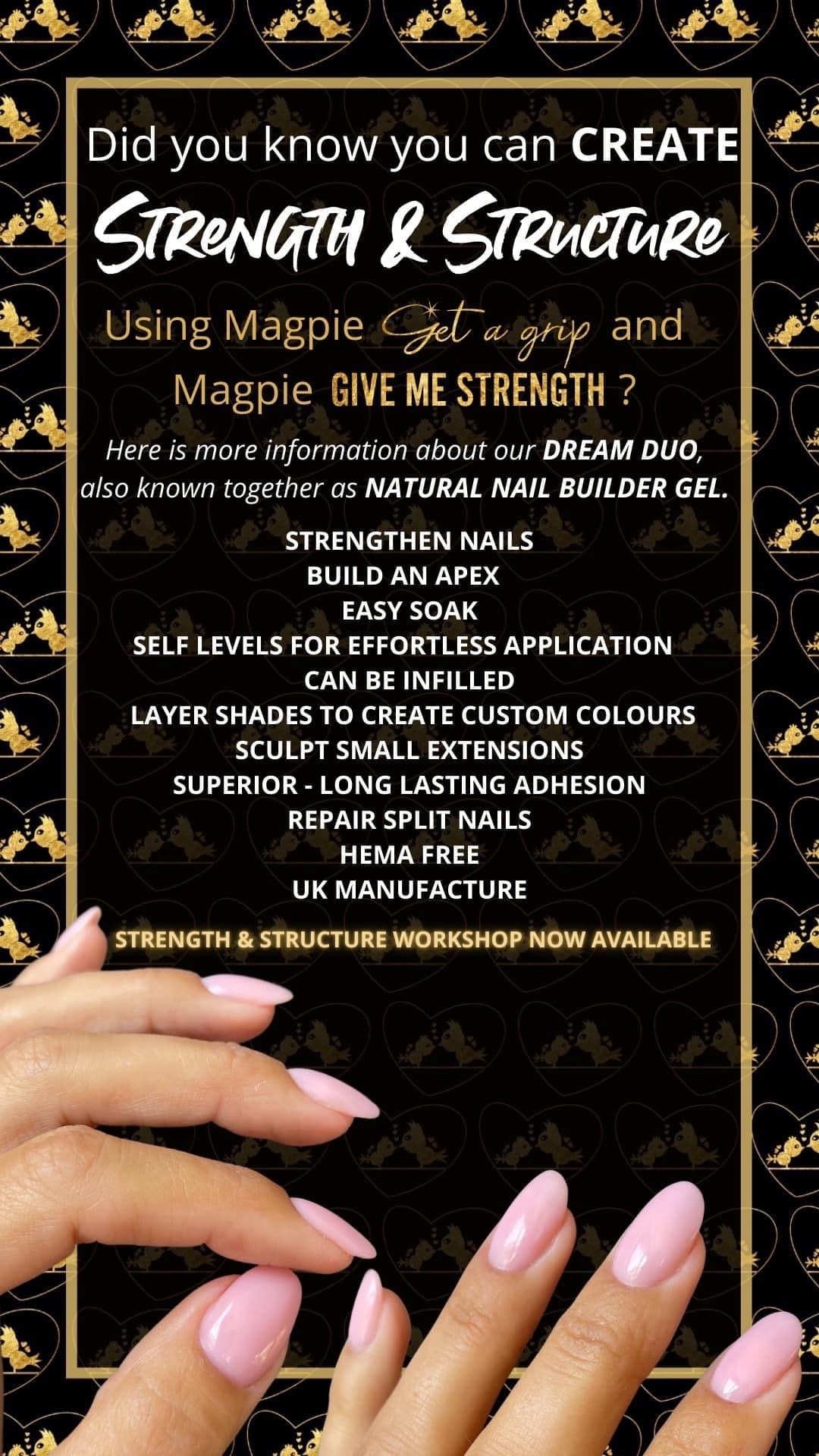 Taking your gel manicures to the next level using our DREAM duo Magpie GET A GRIP & GIVE ME STRENGTH. Learn how to build a beautifully structured gel overlay resulting in a strong and long lasting finish. Demonstrating correct and precise base and structure gel application, finished off with a close up colour and a French tip. Learn how to repair a split nail and how to create a small extension.