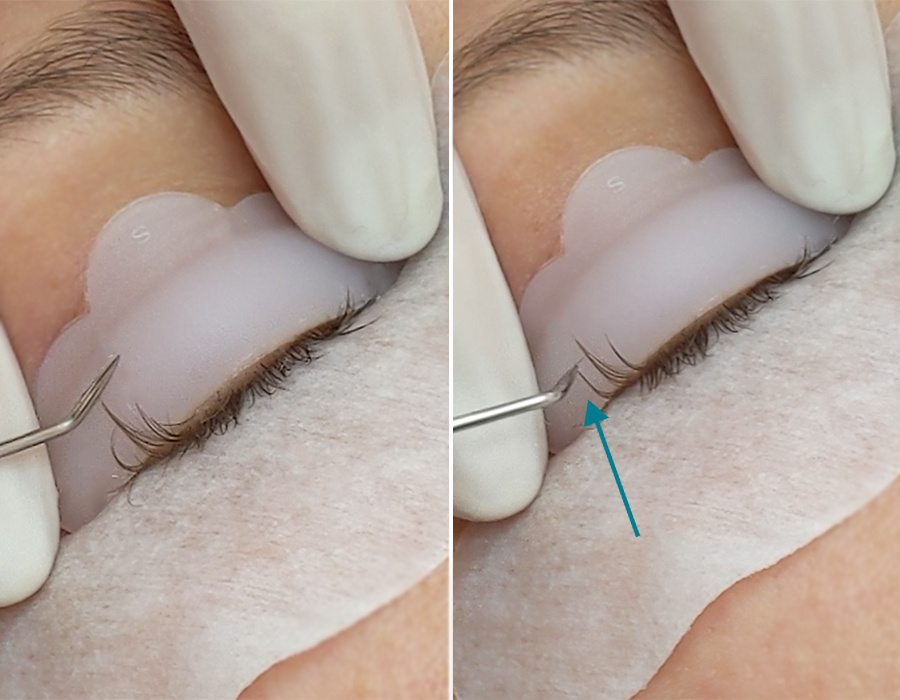 Lashes can become stuck underneath the silicon pads or the eyepatches. It is essential to check to see if this has happened before you move onto the next stage of the treatment. If the lashes are left underneath the silicon pads they will not be lifted and this can be very noticeable and spoil the treatment results. To rescue the upper lashes that are stuck simply hold the silicon pad and gently lift up and if you can see any stray lashes then the precise tip of The Genie can free them ready to be attached