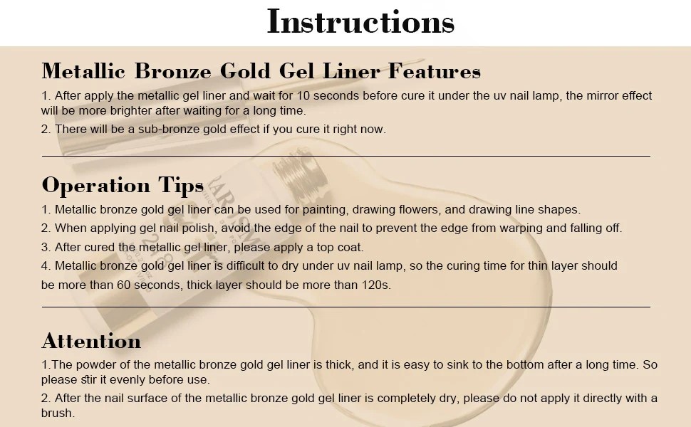 Metallic bronze gold is the base color of nail manicure decoration, especially for nail art manicures. It not only creates a gorgeous momentum for your nails. The minimalist approach to the manicure design is the GOLD glitter line, so this metallic GOLD nail art gel is your essential one.