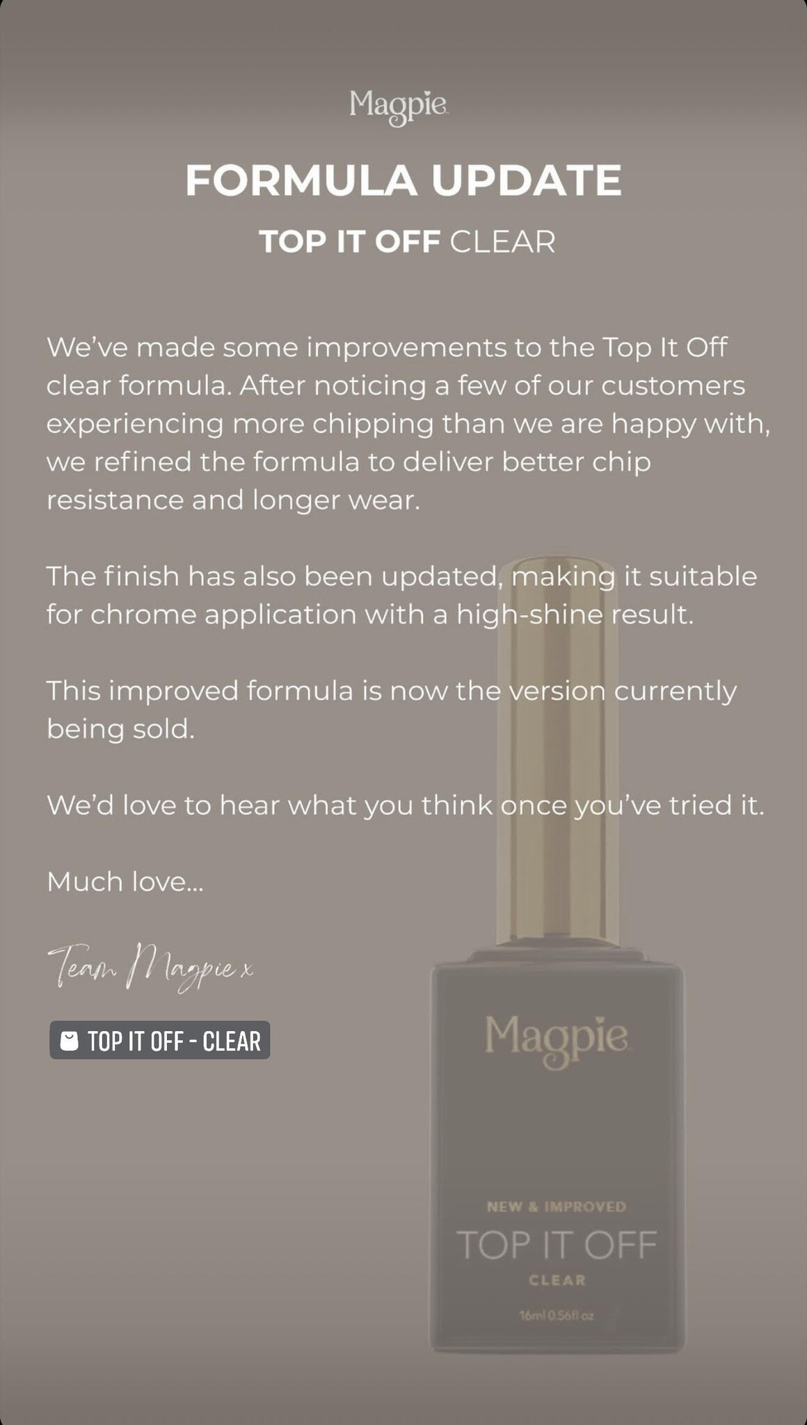 PLEASE NOTE: Top It Off has been refined with an improved, chip-resistant formula for enhanced wear. The updated finish makes it suitable for chrome application while maintaining long-lasting shine and durability.